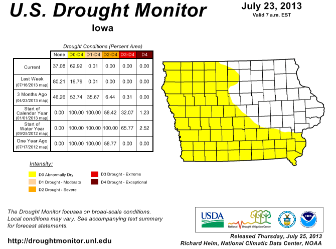 Over half the state of Iowa is now classified as abnormally dry, including the Raccoon River Valley.
