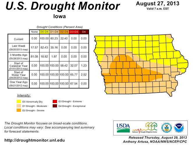 According to the National Climatic Data Center, the drought conditions went from moderate from severe this week for much of central and east-central Iowa.