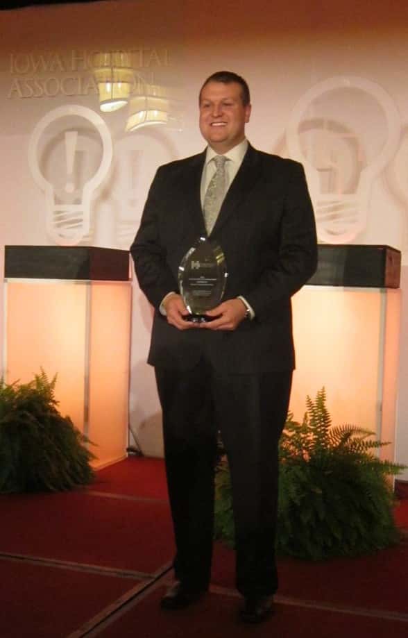 The annual award was presented to Behne at the Iowa Hospital Association’s fall conference earlier this month. He was nominated by the medical center’s executive board which consists of Chief Financial Officer Mark VanderLinden, Christa Simons, Support Services; Joan Overby, Outpatient Services and Clinics; Cindy Kail, CNO; and Roger Overby, Information Technology.