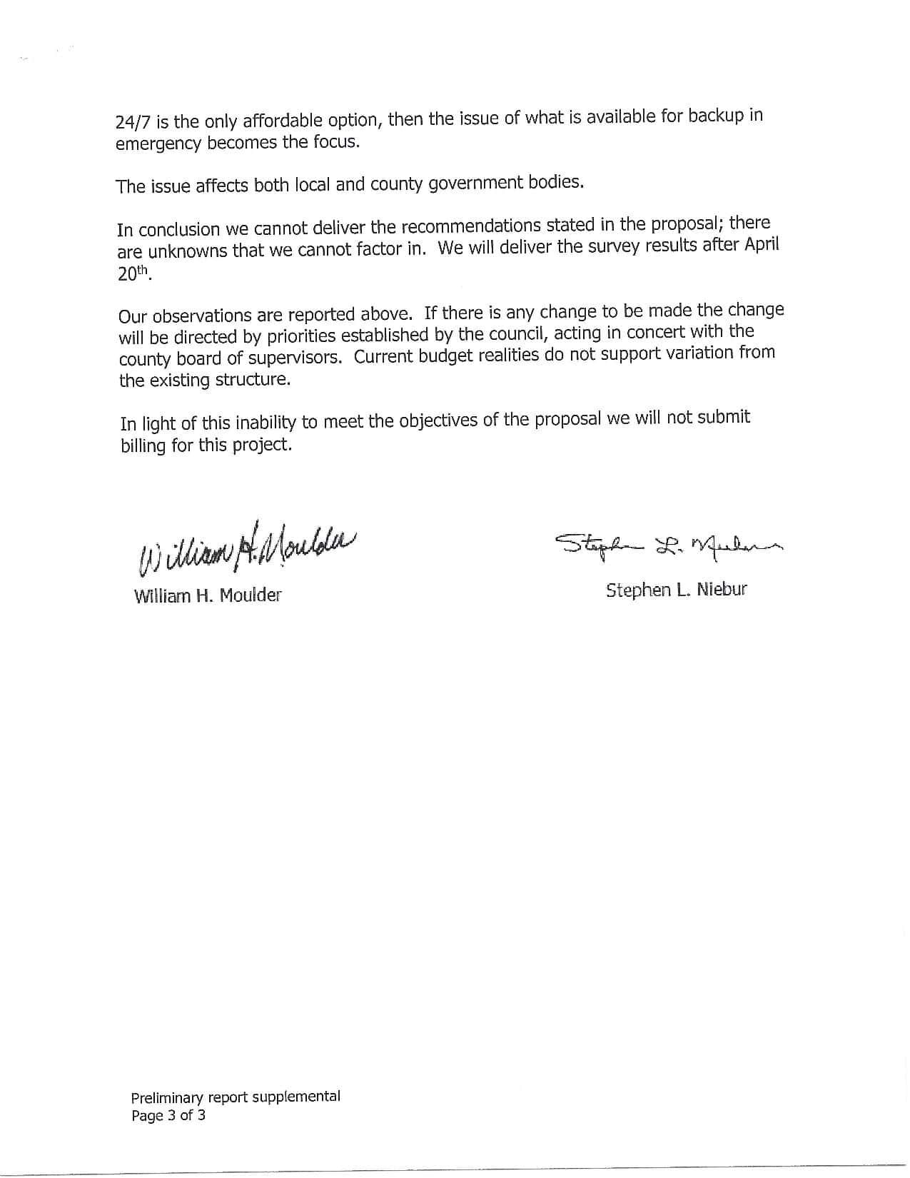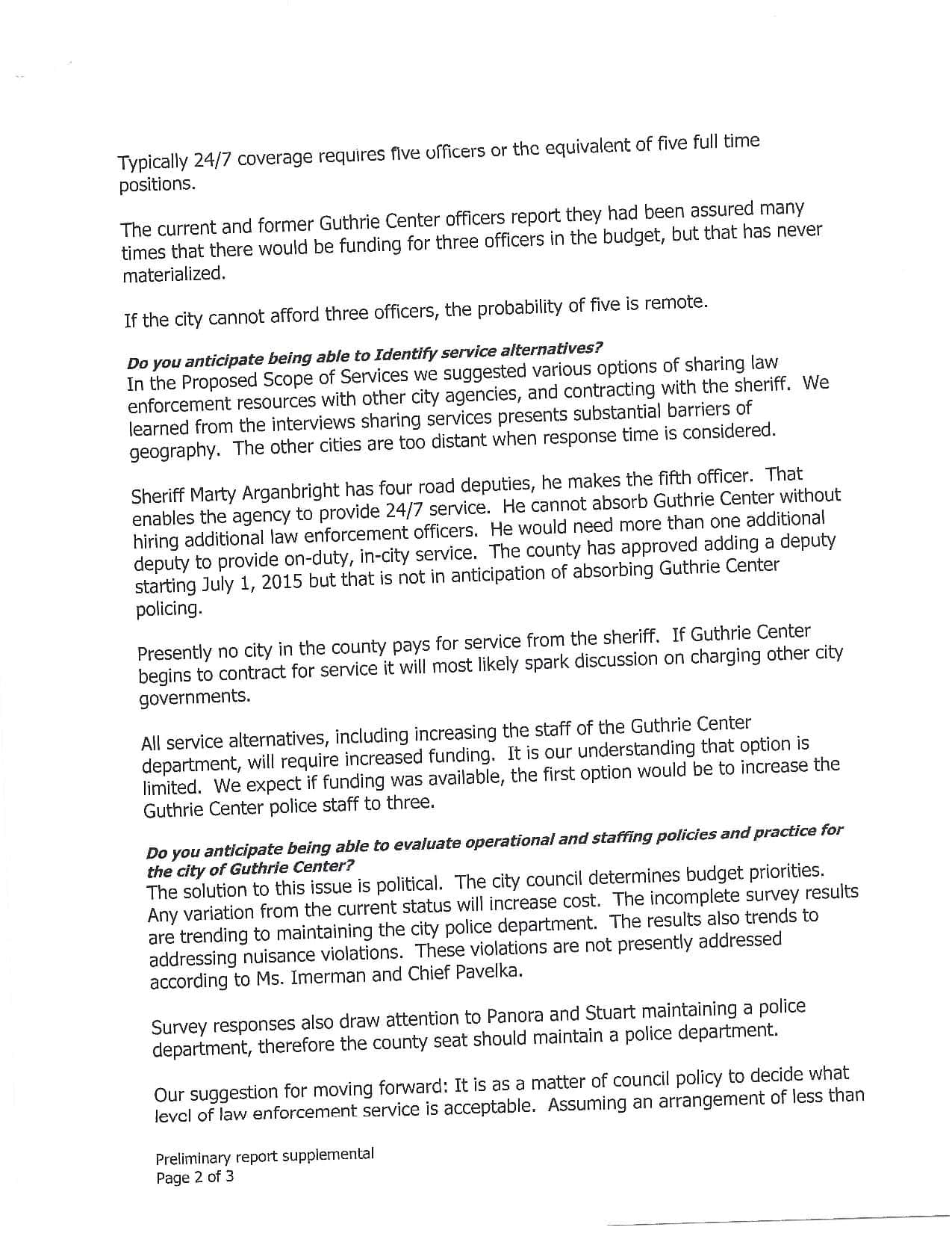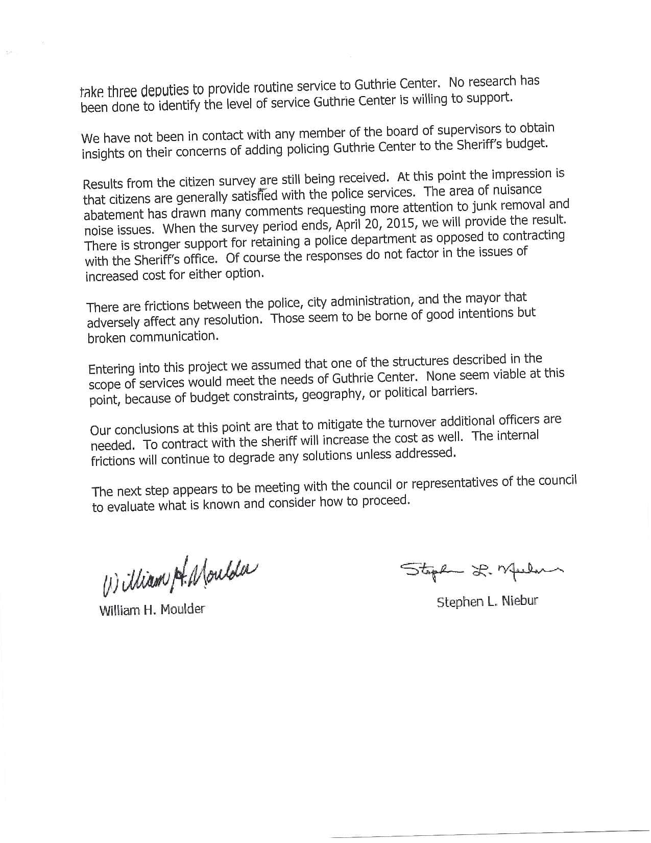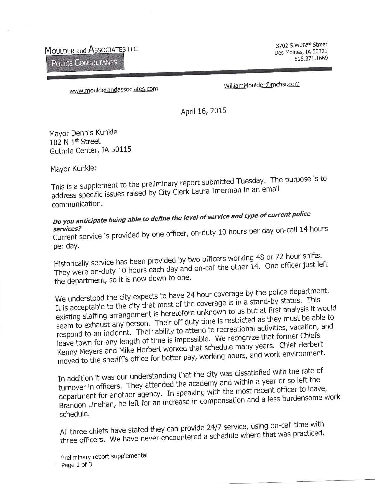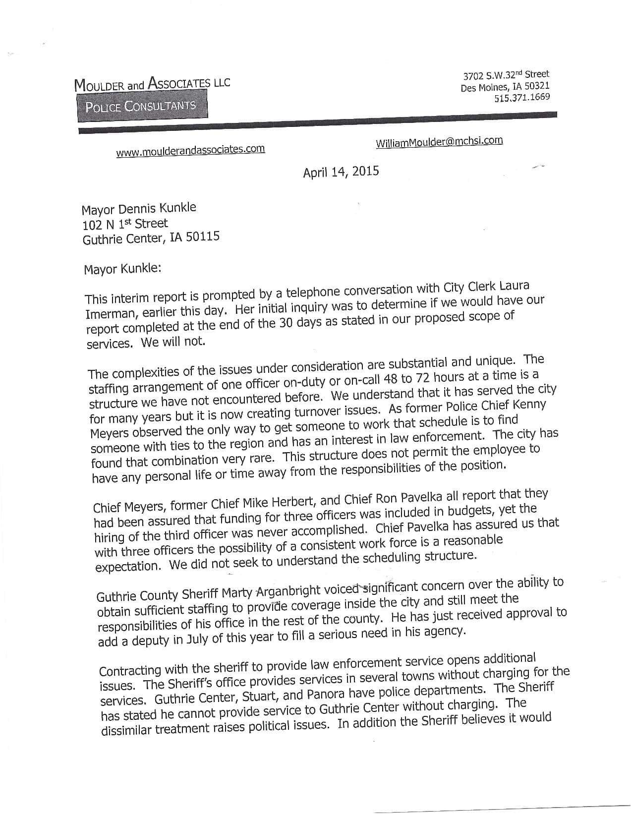 The Guthrie Center City Council expressed disappointment Wednesday night, after getting back the results from Moulder and Associates Police Management Consultants’ evaluation of the City’s Police Department. That evaluation was unable to meet its objectives, citing ‘substantial and unique’ complexities surrounding the situation. The council is still interested in having the Guthrie County Sheriff’s Office provide law enforcement to the city and thought of two proposals to make that happen. The first proposal would be to maintain their current one-man police department for weekday coverage and contract the Sheriff’s Office to cover the city on nights and weekends. The second proposal would eliminate the police department and would have two sheriff’s deputies patrolling the city a total of 60 hours per week. Mayor Denny Kunkle says he plans to discuss the financial numbers of the two plans with the Guthrie County Board of Supervisors and Sheriff Marty Arganbright in the coming days. You can read the full report from Moulder and Associates below (click on each page to view/read it in full):