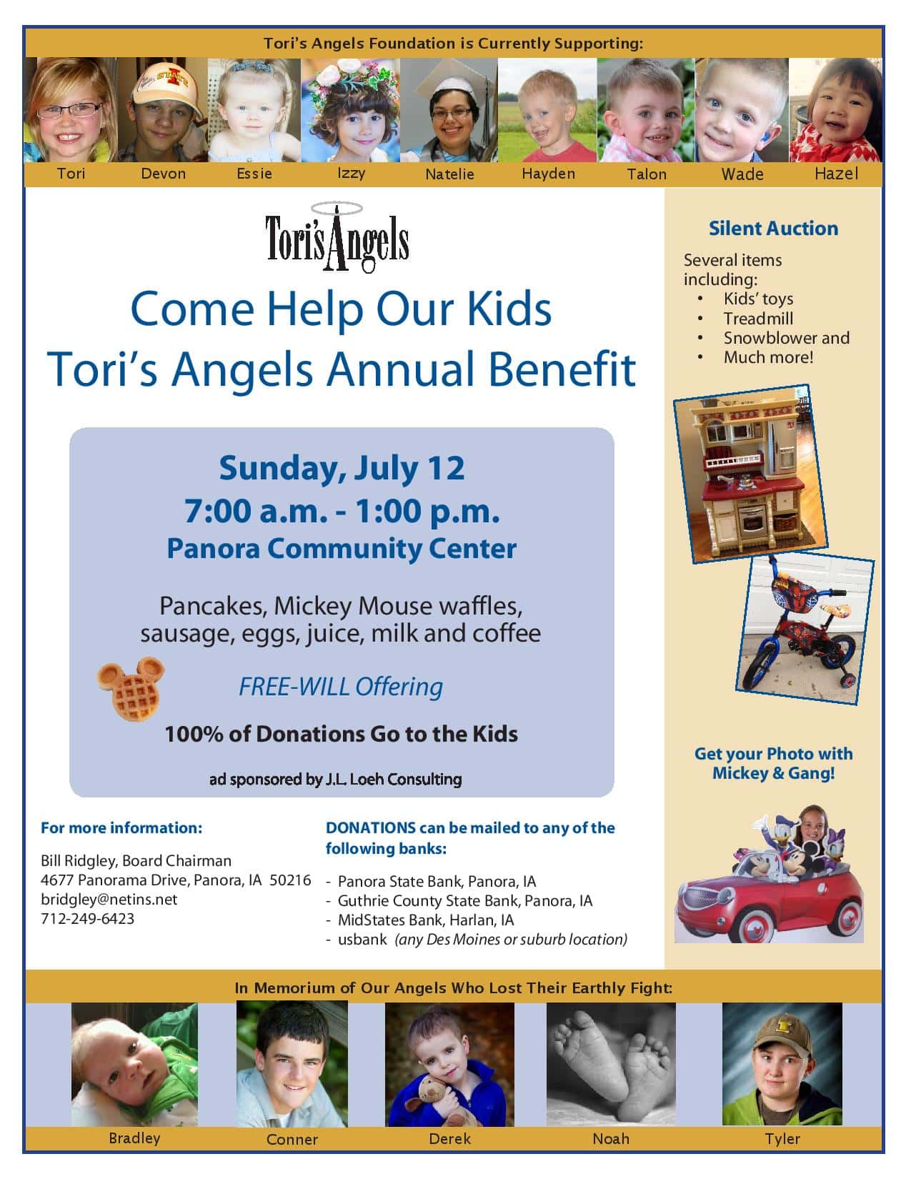 A benefit will take place in Panora this weekend for a nonprofit organization with the goal of helping children with life threatening illnesses. President Bill Ridgley says Tori’s Angels pays all medical expenses for terminally ill kids in Iowa. “What we do is if the child is accepted, we take them on until their 19th birthday and we pay for all of their copay, all of their deductibles. We pay for all travel expenses like airline fees, hotel accommodations and food for the child and the parent, to get the life saving care anywhere in the continental United States.”