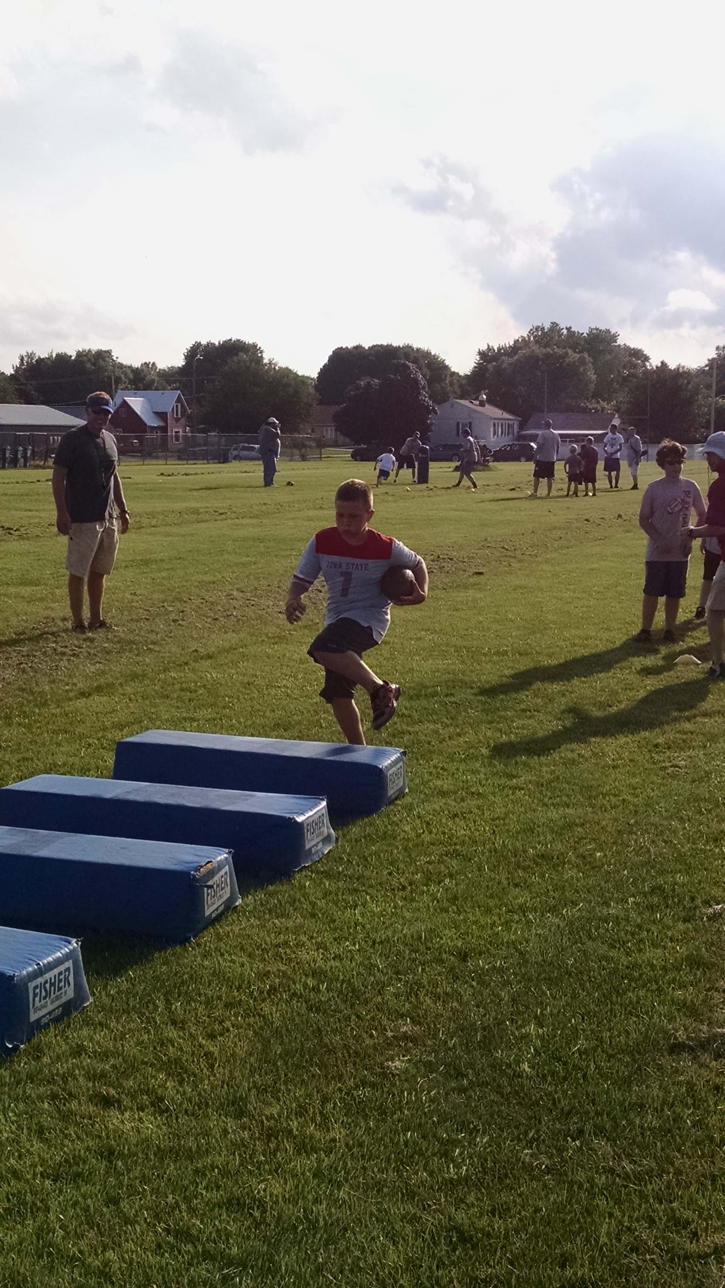 The camp was divided into 5 stations where kids learned the basics and safe fundamentals of football. They ended the session with an Ultimate Style of non-contact football and frozen treats. The camp continues today from 10:30 to noon today.