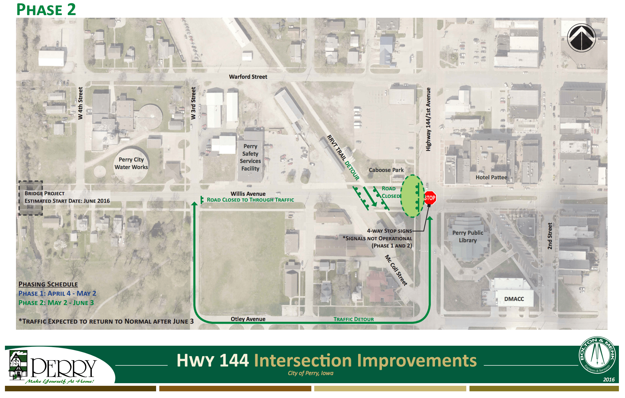 City Administrator Sven Peterson says the north and south sidewalks are now open to pedestrian traffic. The east side of the intersection is now open with a three-way stop and crews have transitioned to the west portion of the project.