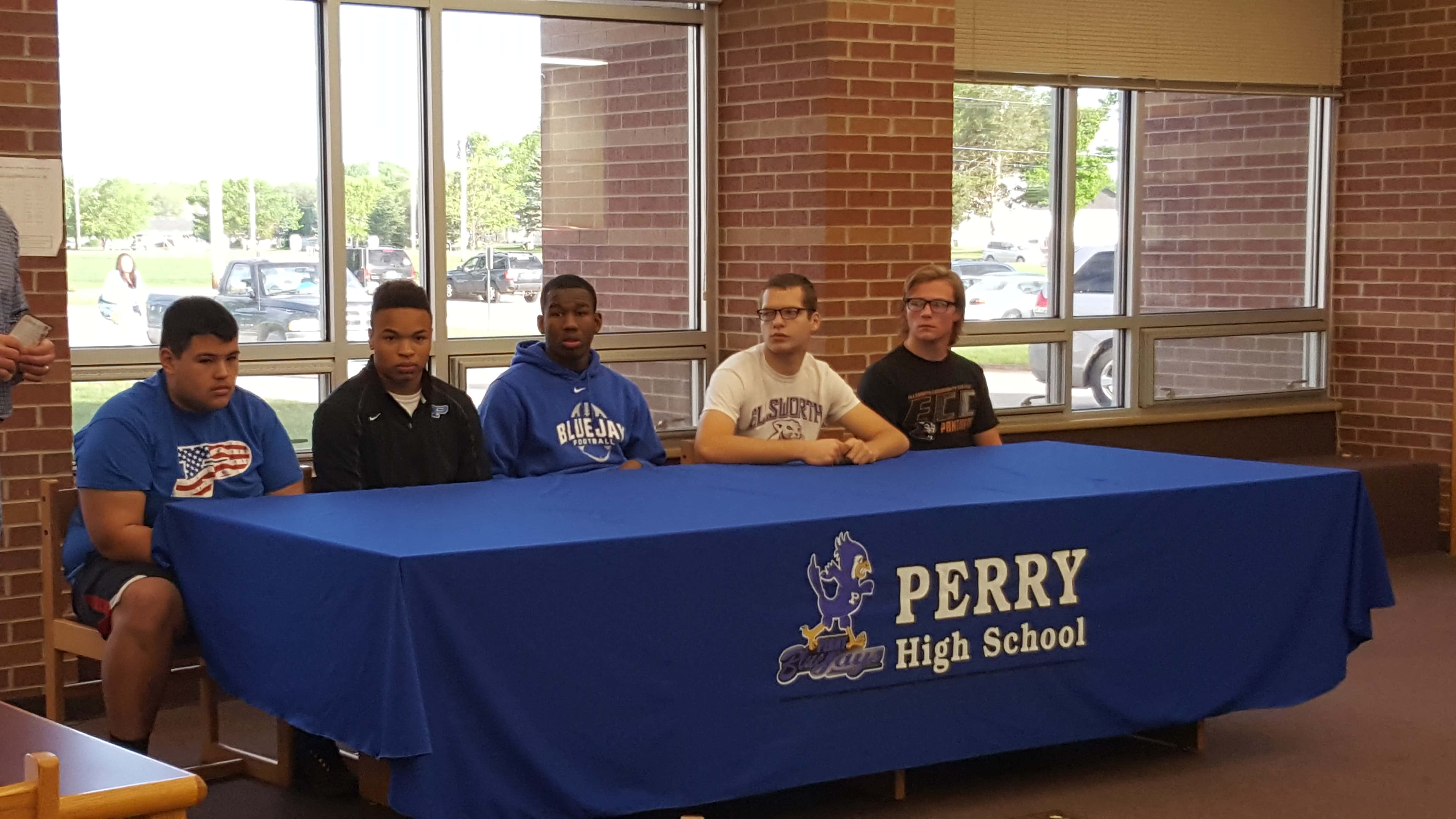 “We are definitely very proud of them,” smiled Perry Head football coach Jason Olejniczak. “It is really neat to see 5 teammates stay together and have the opportunity to play at the next level. It does say that our program is putting out players who love football and want to continue to play at the next level along with the ability to play at the college level. I was sitting here with mixed emotions and chuckling whether we should have won a few more games.”