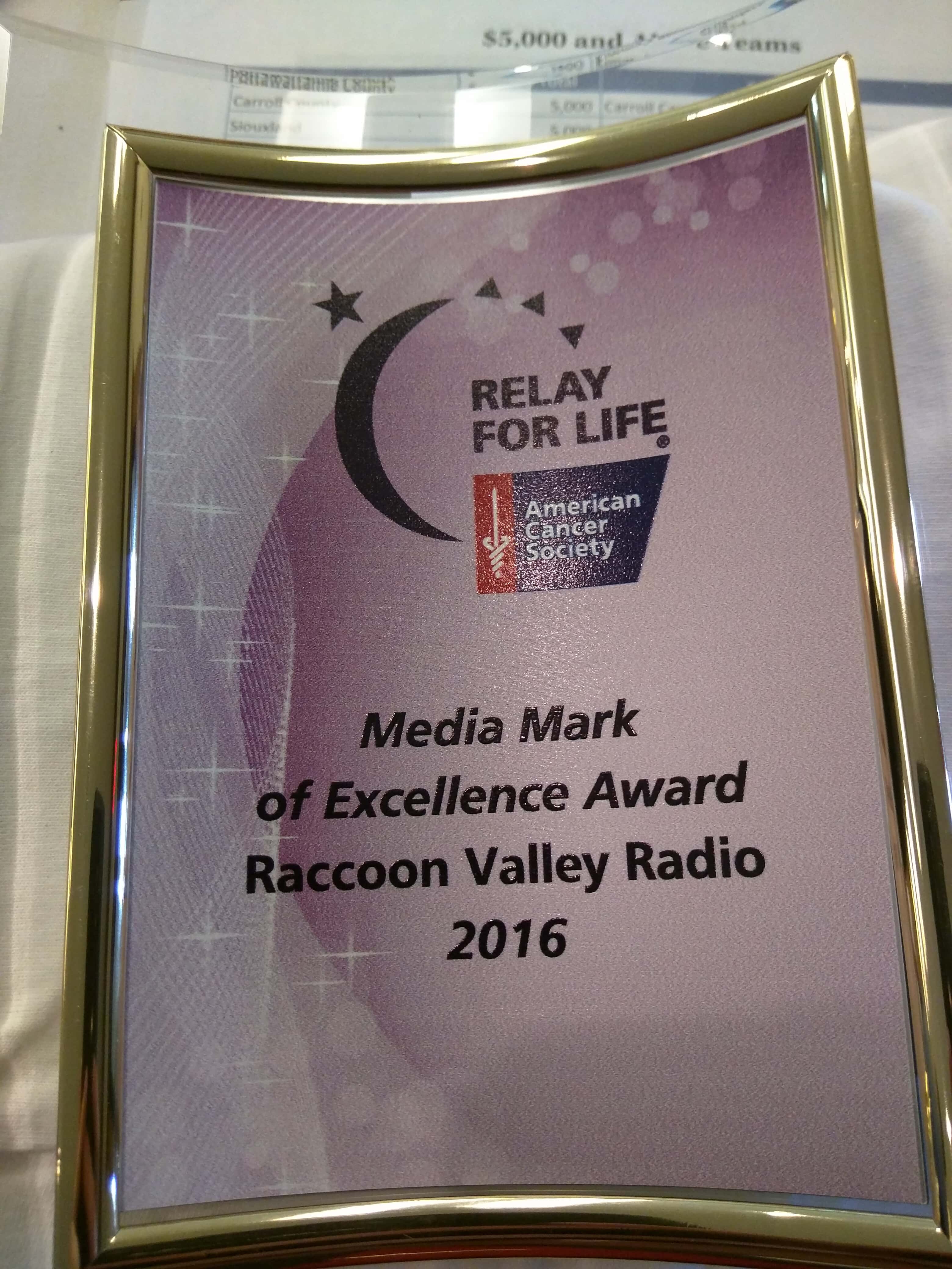 Raccoon Valley Radio received the Media Mark of Excellence award at a Relay for Life Leadership Conference held yesterday. Program Director Chris Cohea attended in order to accept the award on the stations behalf. Raccoon Valley Manager John McGee says it an honor to work with the organization. “We are honored to be selected for the Media Mark of Excellence Award. We are so grateful to be able to help the Midwest division of Relay for Life. We have worked on projects with them in Greene and Guthrie County.” The Media Mark of Excellence Award is given to an organization for its support and efforts to share information about Relay For Life.