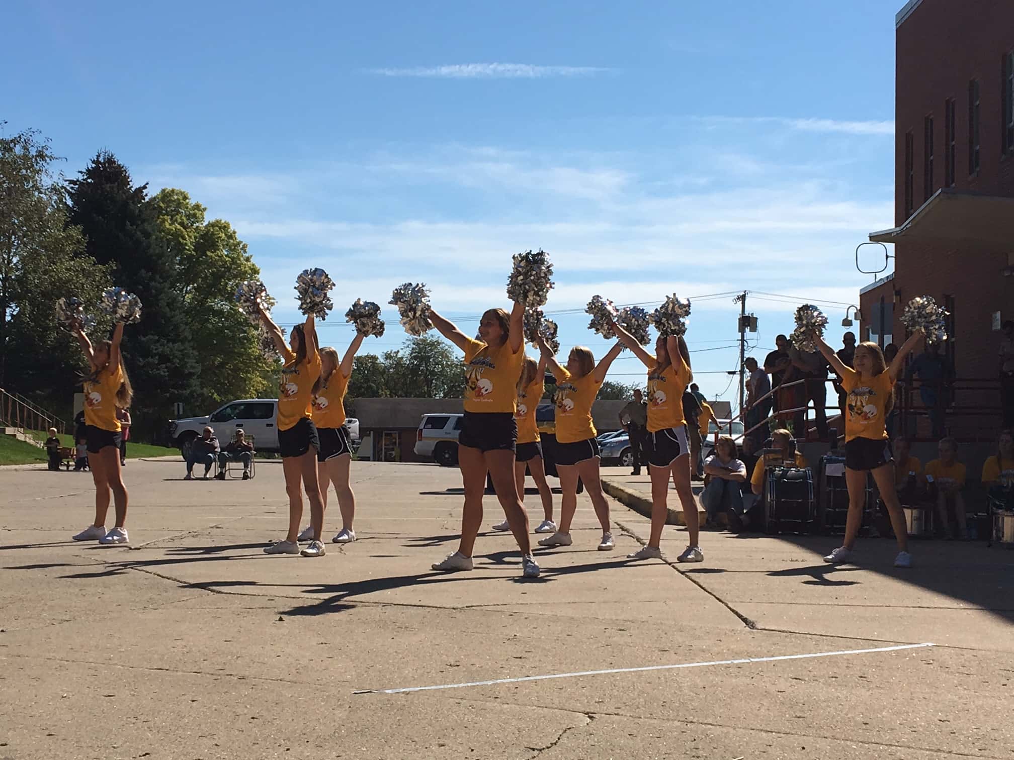 The parade began with the presentation of colors followed by the high school marching band and elementary students. The homecoming king and queen candidates were interspersed among the various junior high and high school classes. The assembly culminated in a pep rally on the eastern end of the courthouse. The choral and band departments gave an update on upcoming activities and the fall sports teams thanked the student body for their support. The ACGC dance team, drumline, and cheerleaders also performed.