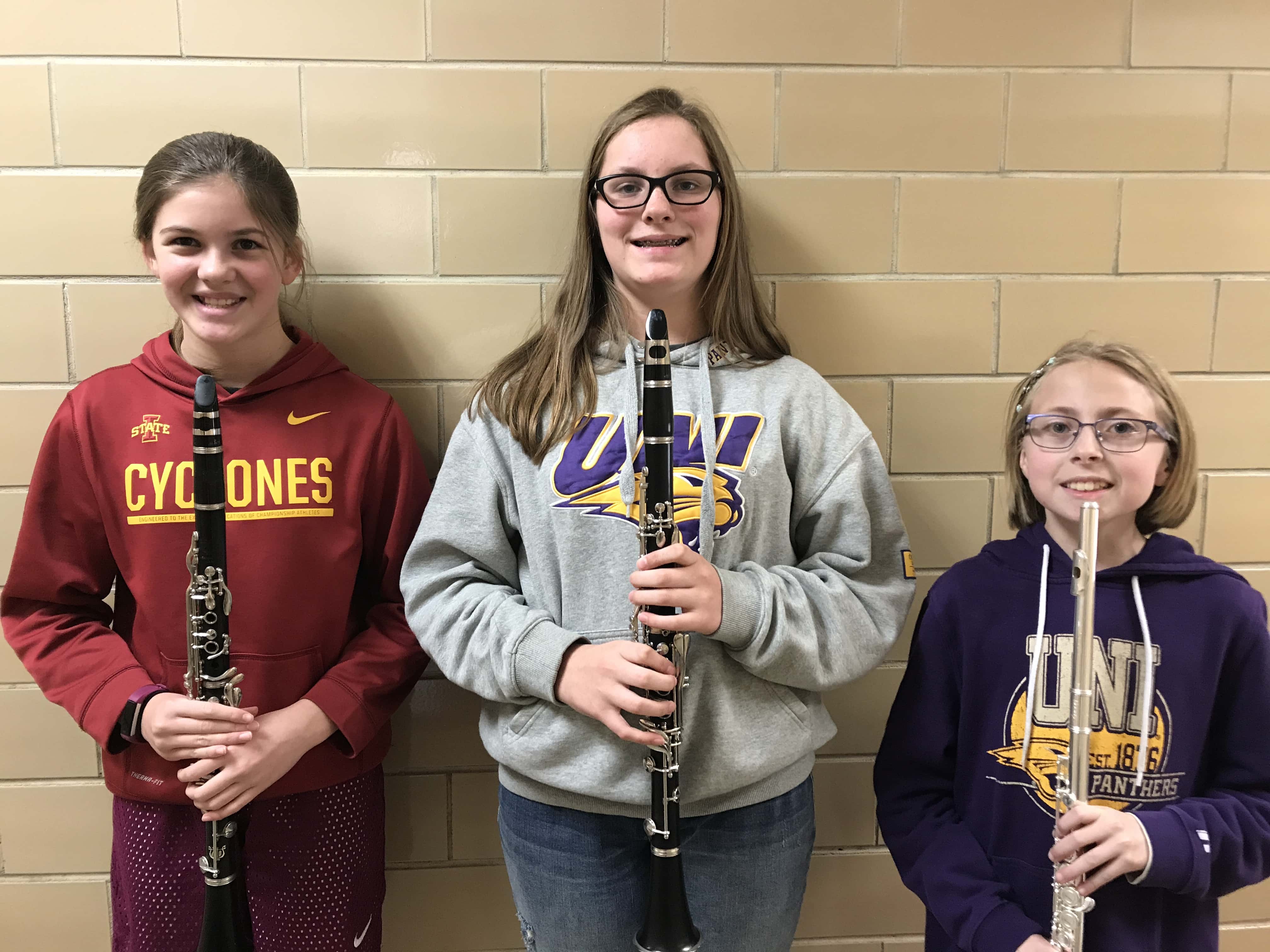 Three middle school band students will have the opportunity to perform in the South Central Iowa Band Master’s Association Honor Band. Natalie Heupel qualified on bass clarinet, Ashlynn Hinners on clarinet and Brianna Blasnitz made it on flute. The trio will perform with other students from the region at Waukee High School on November 7th.