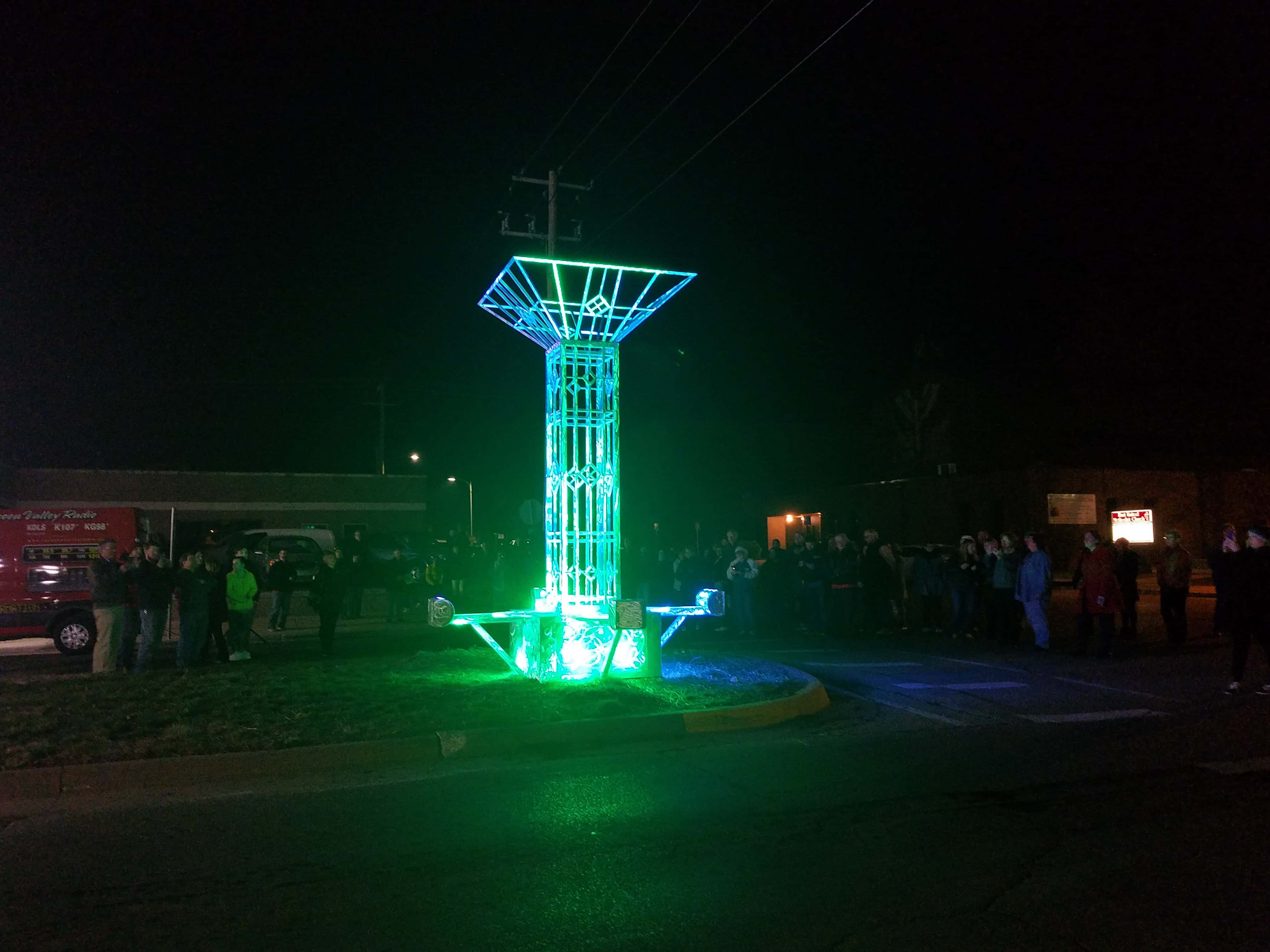 Clark then turned on the sculpture’s lights, which were designed by Mike Lambert, and the street corner was bathed in cool blues and greens. The colors contrasted nicely with the warm reds and oranges emanating from the other end of the block, where the first Streetscape sculpture, “Born of Fire,” is currently standing. There will be two more sculptures added within the next year, each honoring an aspect of Perry’s history that helped it become the City it is today. Raccoon Valley Radio’s Chris Cohea served as the emcee for the event, along with the Big Red Radio.