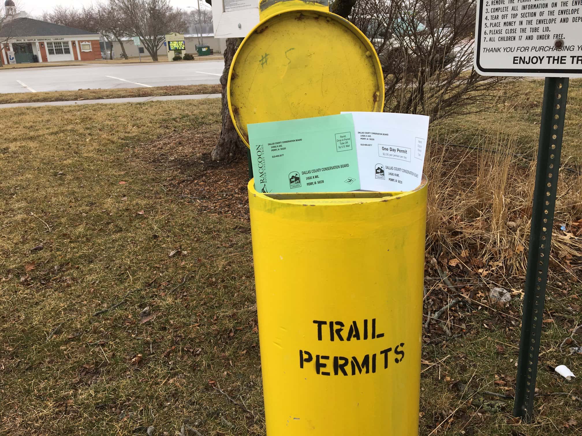 Annual passes for the trail are $10, and daily passes cost $2. A pass will allow you to use the trail for cycling, running, or walking. Passes can be picked up at any of the county conservation departments in Dallas, Greene, or Guthrie counties. Additionally, you can get a permit in one of the yellow trail tubes found at trailheads, which can be filled out and mailed back. Green envelopes are for annual passes, while the white ones are for daily passes.