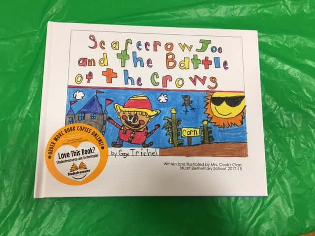 Each year the students write and illustrate a picture book based on the themes and lessons they learned to enhance their reading and writing skills. Lori Cook’s class unveiled their book, “Scarecrow Joe and the Battle of the Crow,” in dramatic fashion with a drum-roll and wand-waving. Then each student read sections of the whole book aloud in front of the audience. They also presented one book each to school custodian Becky Huddleson, and the Stuart and Menlo public libraries. The ceremony concluded with the traditional autographs by the young authors.