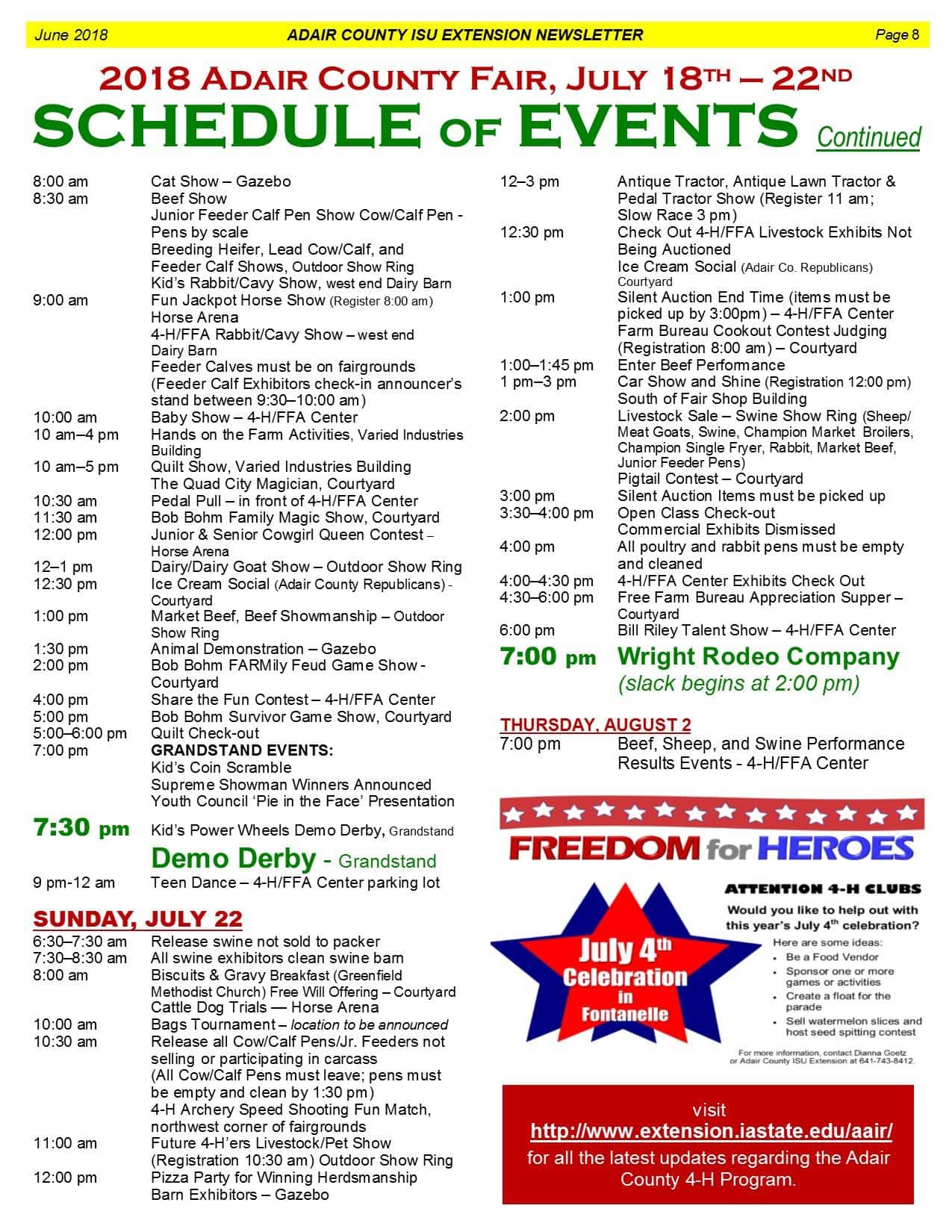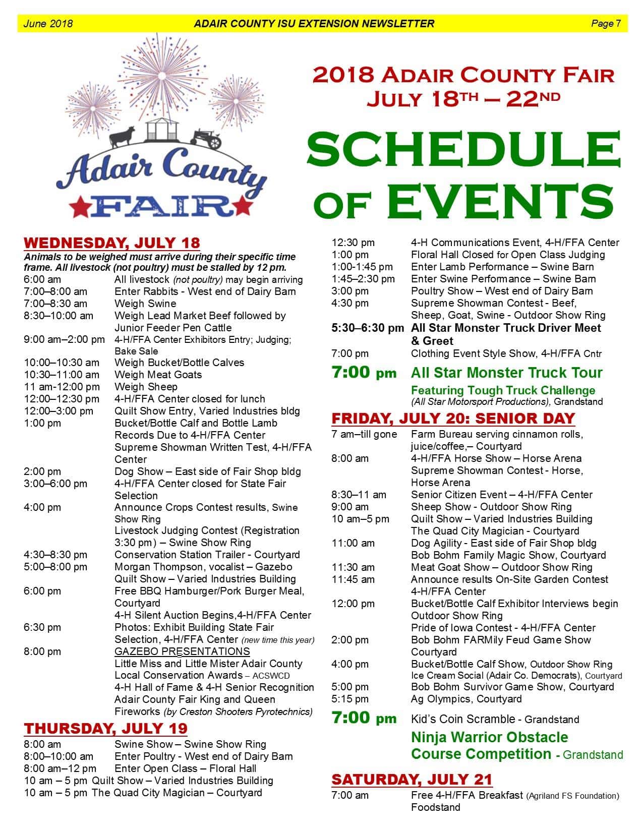 Summer is a time for annual events and festivals throughout Adair and Guthrie County. County fairs are no exception. The Adair County Fair Board recently released the schedule of events for this year’s fair to be held next month. The fair starts on Wednesday, July 18th in Greenfield, and ends on Sunday, July 21st.