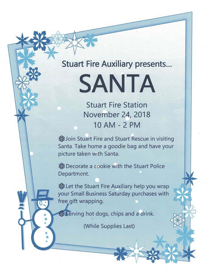Kids will get to have their picture taken with Santa and receive a goodie bag. Participants can also decorate cookies and drink hot cocoa with the police department, and the auxiliary will help wrap your Small Business Saturday purchases for free. The auxiliary will also serve hot dogs, chips, and a drink while supplies last. This event is free to the public, and lasts from 10 a.m.-2 p.m. at the Stuart Fire Station.