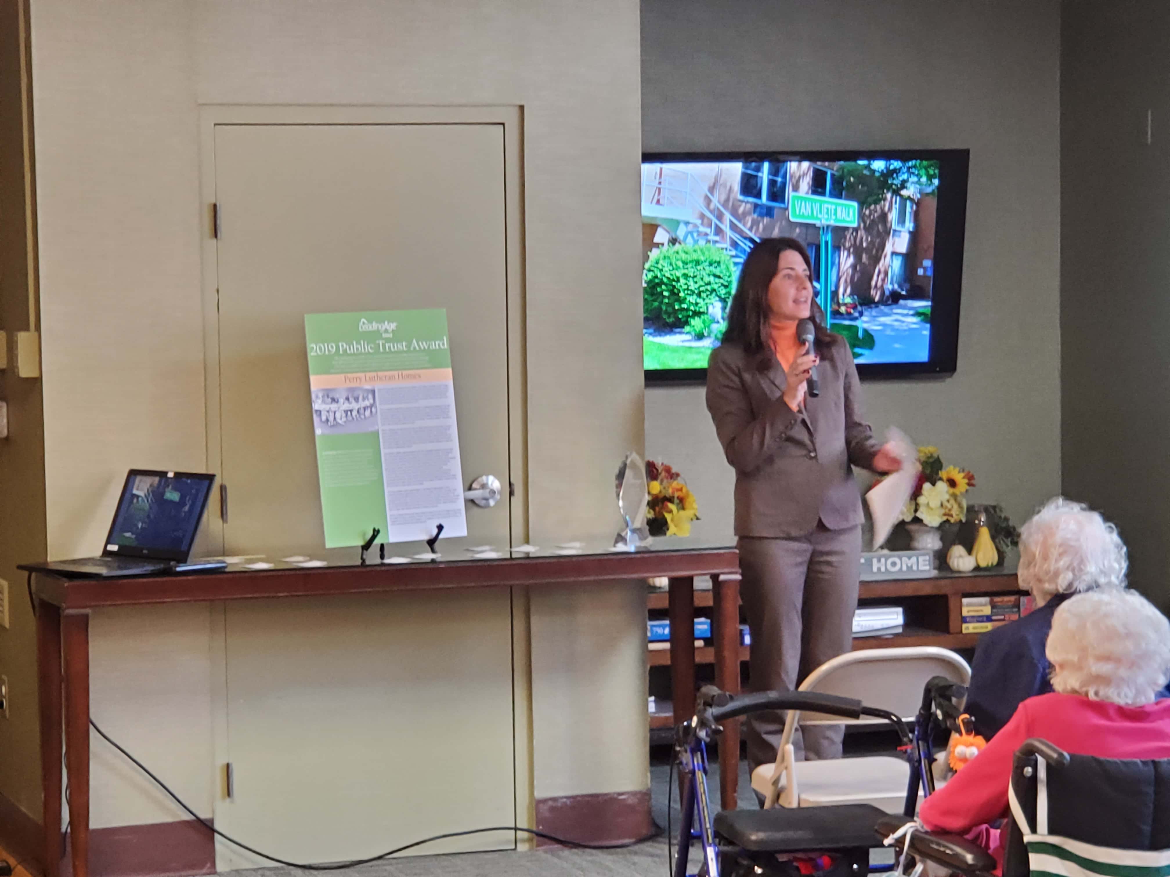 The PLH staff brought together members of the community, their Board of Directors, and residents of the elder care facility in recognition of the two awards they received recently from LeadingAge Iowa. Shannon Strickler, President and CEO of LeadingAge, was on hand to present the 2019 Public Trust Award for the PLH StepUp! Movement, as well as the 2019 Board Member of the Year Award to Bill Van Vliete. Strickler said they annually present nine awards to their member organizations for various accomplishments, and Perry Lutheran Homes has been a frequent recipient in the past.