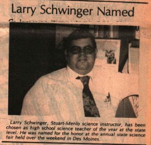 Larry Schwinger passed away at the age of 70 Monday in his home. Schwinger taught science for over 30 years at Stuart-Menlo and later West Central Valley High School until his retirement in 2008. During that time he hosted science fairs and with his wife Jolene he would escort students to state, national, and international events. Schwinger was honored by West Central Valley with a Salute to Science Fair program in 2014.