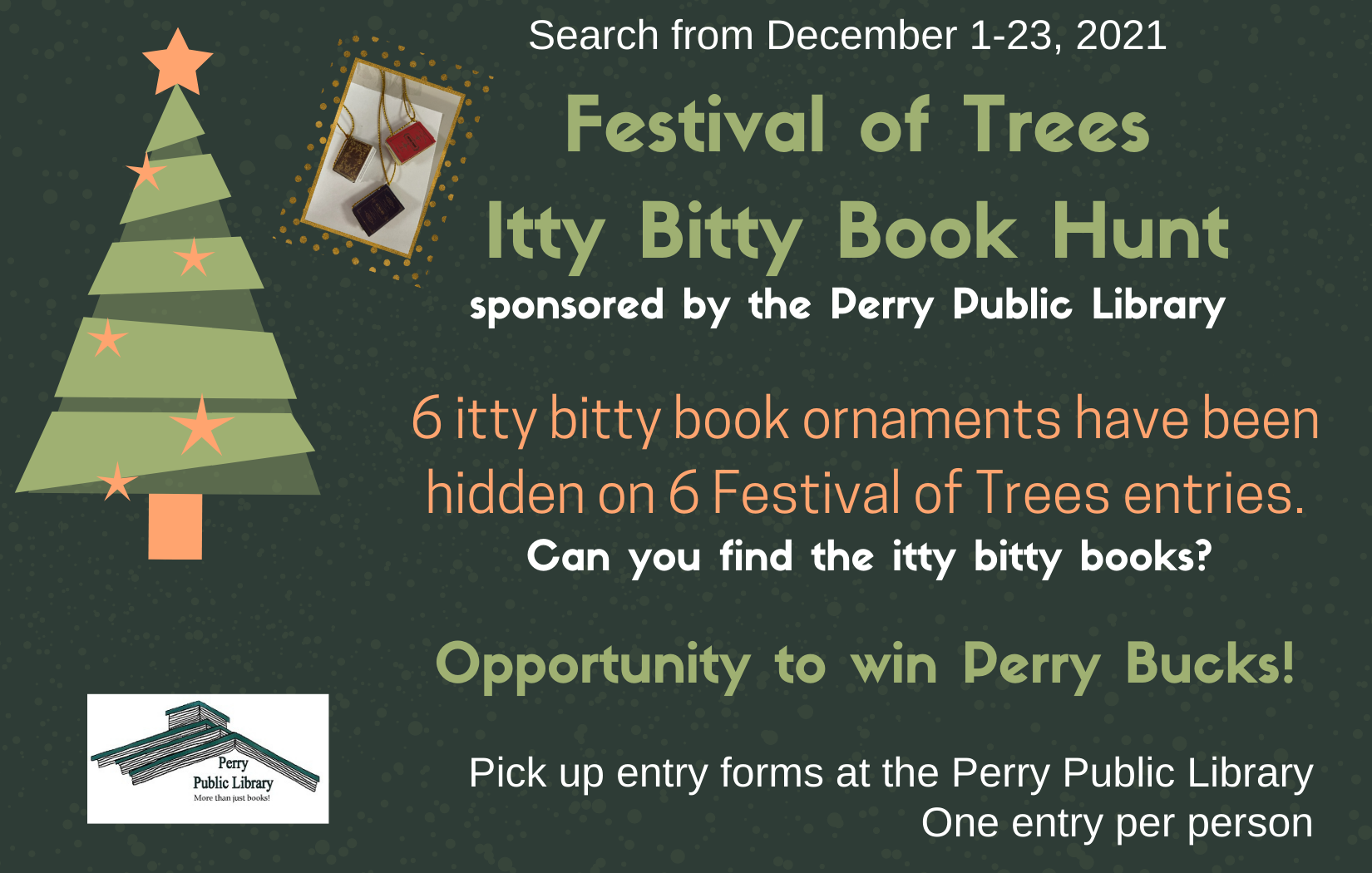 The Perry Public Library has been sponsoring the “Itty Bitty Book Hunt” where people can find six little book ornaments hidden in trees in Perry area businesses who are participating in the Festival of Trees Reshuffled. People can find all six ornaments to then turn in an entry form to potentially win the prize of Perry Bucks.