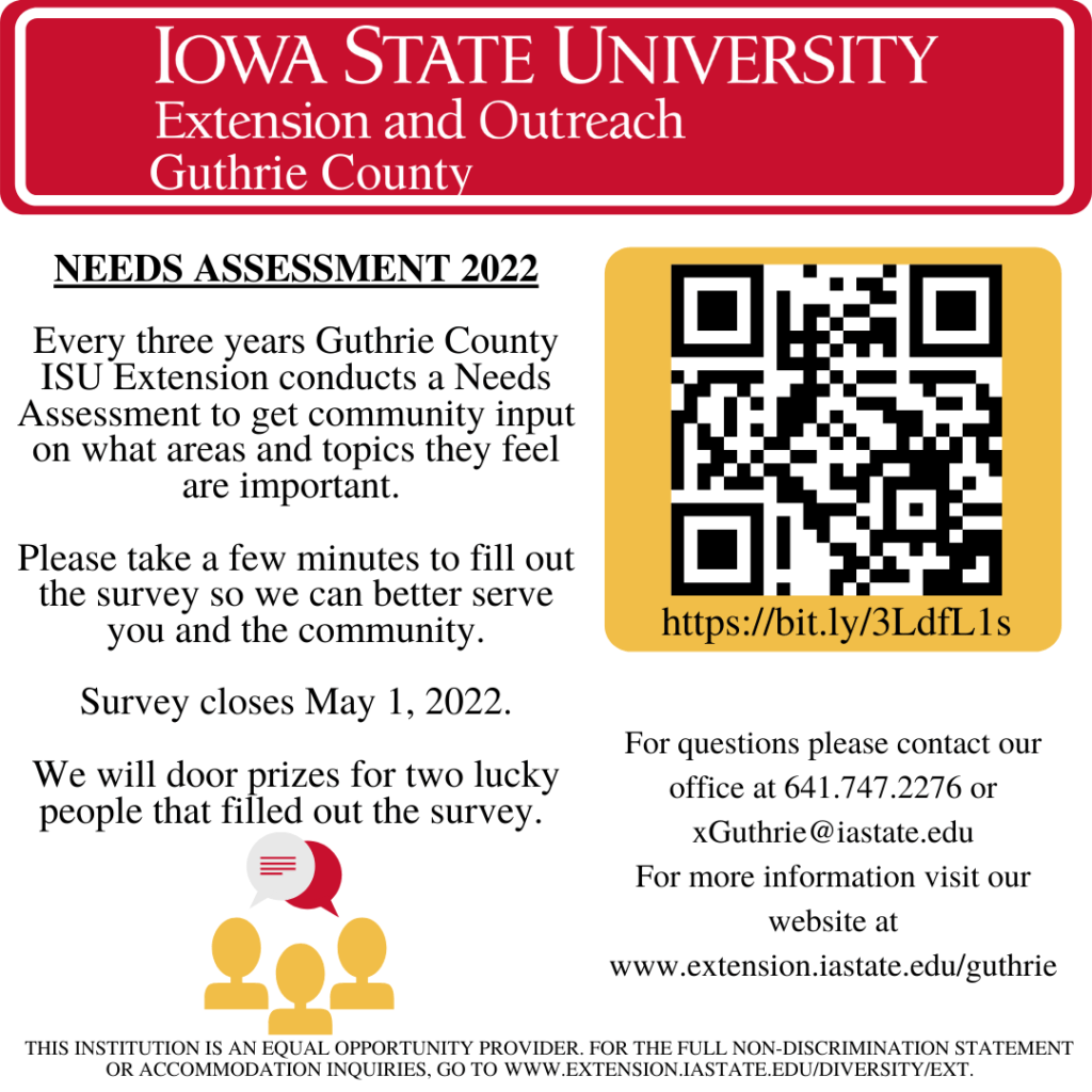 Every three years the Guthrie County Extension Office presents a Needs Assessment Survey for the Guthrie County residents. This survey will ask the community’s input on what areas and topics they feel are most important to them and what programs are best suitable for the county. The survey will only take a few minutes and people that fill out the survey are eligible to win a prize. The deadline to fill out the survey is May 1st and the survey will be linked here.