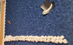 “We have bought, some people might deem an excessive amount of cotton balls but I think it’s perfectly the right amount, and we have actually started building two competing snowmen. So one is the snowman that is being built that is being built if you return winter, Christmas, Hanukkah, hibernation, snow, anything that goes with like winter themes, and the other snowman is any other books that you’re returning.”