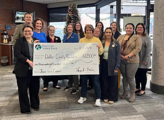 Raccoon Valley Bank donated $1,800 each to the Dallas County Foundation and Dallas County Habitat for Humanity to raise money for their Jeans for a Cause program. According to Marketing Manager Brooke Ruddy, bank employees opt in to wear jeans on Fridays during the year, with the funds donated to local non-profit organizations who will then give back to the community. She expresses that the bank is in the third year of doing the Jeans for a Cause fundraiser.