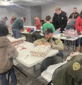 Greene County Sheriff Jack Williams said all of the participating kids were picked up at the law enforcement center administrative building in a school bus and taken to the Walmart in Boone to shop for their family members in their households and themselves, with a total of $150 to spend. Afterwards the kids were taken back by bus to the law enforcement center administrative building where they enjoyed free pizza and wrapped their gifts with the Iowa State Patrol Troopers, Sheriff’s Office personnel, Jefferson Police Officers and volunteers with the Jefferson Kiwanis Club.