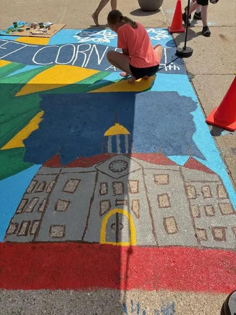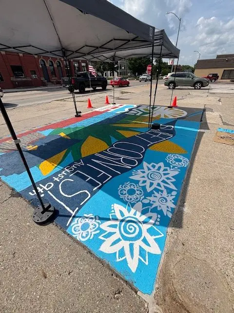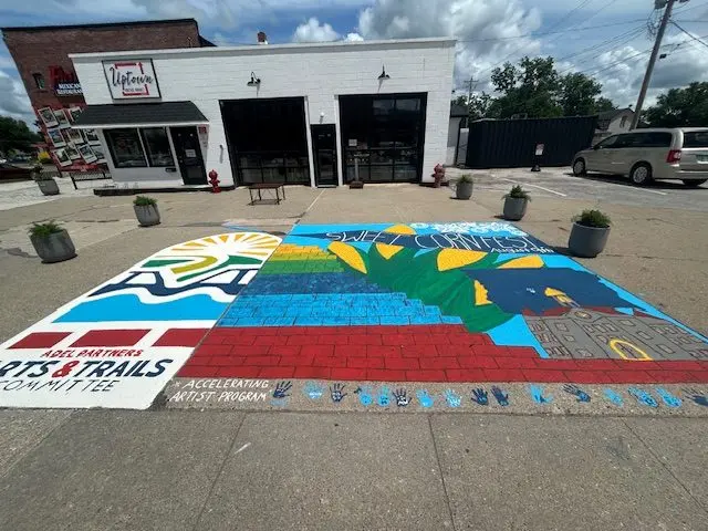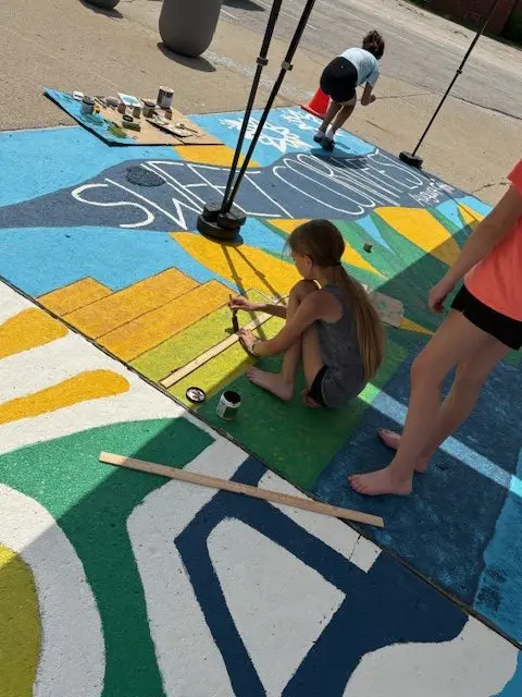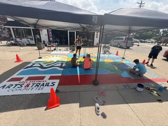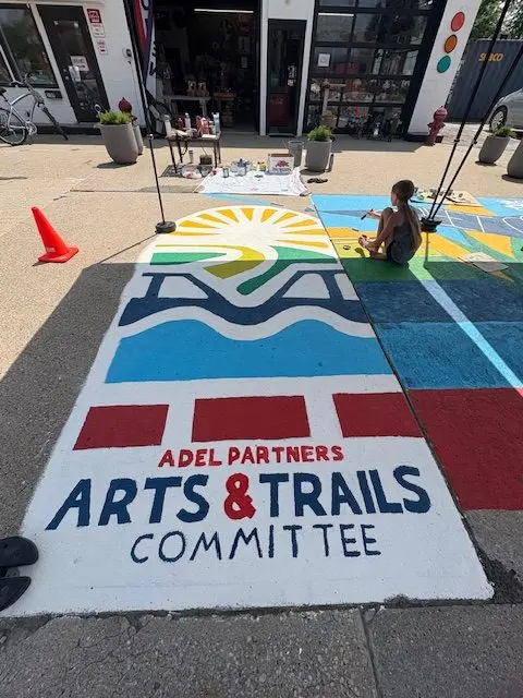 Adel Partners Chamber of Commerce Board President Erin Milroy explains that they wanted a way to celebrate the artwork as well as the trails in Adel, and worked with the Chamber Arts and Trails Committee to create a mural on the ground by Uptown Vintage Market on the east side of Main Street.