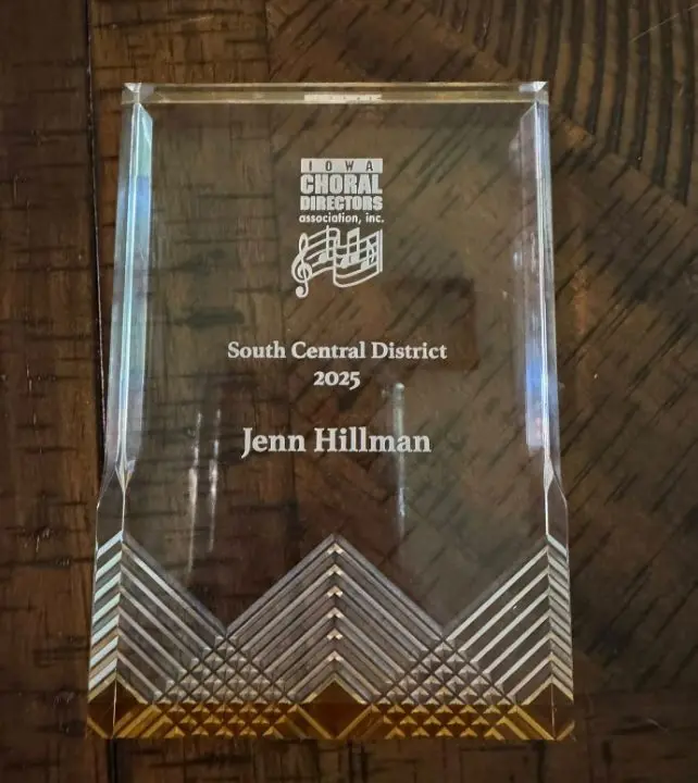 Musical Director Jenn Hillman was given an award from the Iowa Choral Directors Association (ICDA) at the 50th Music Symposium in Pella in the second half of July. According to the Perry School District, Hillman was honored for her outstanding work at the high school level to support students’ love of music in the classroom and in extracurricular opportunities. She was granted the award for ICDA’s South Central District.