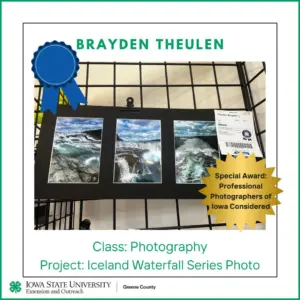 Anderson also received a Seal of Merit for her personal development communication exhibit. Other top finishers for the 4-H static exhibitors included Braydon Theulen who was tabbed for the Professional Photographers of Iowa Consideration Award and Eli Hardaway was the Judge’s Choice with his personal development self-determined exhibit.