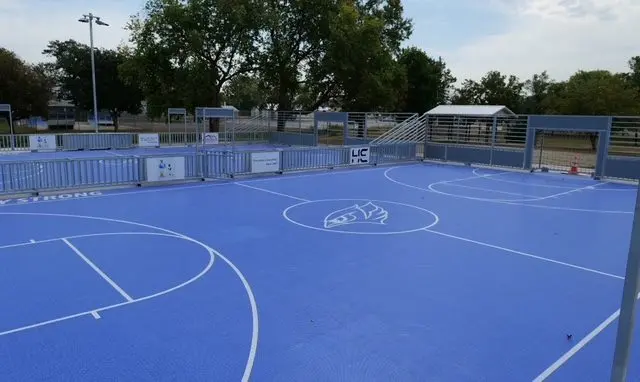 Halling explains that during the planning phase, the Parks and Rec Department wanted to make the structure as big as possible, so they decided to go with a double pitch, which allows for both basketball and soccer. She outlines that between the planning phase and construction, the whole project took about 18 months to complete. Halling concludes that the mini-pitch is open to the public for free.