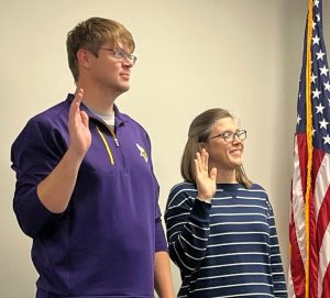 Tim Riphagen (left) taking Oath of Office as VP and Cindi Daubendiek (right) taking Oath of Office as president/Raccoon Valley Radio-Coltrane Carlson