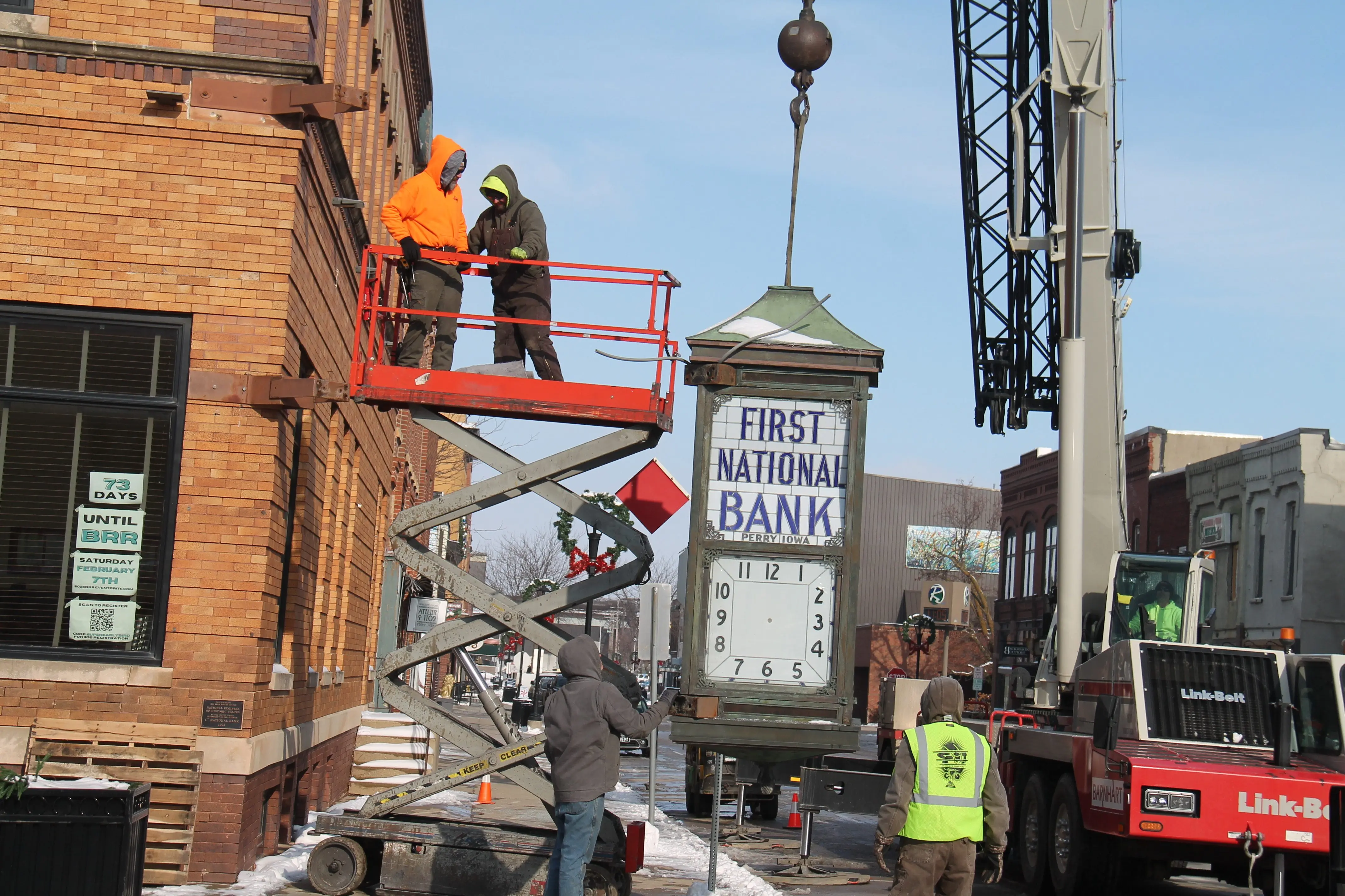 A clock that has hung on the corner of 2nd Street and Willis for years was removed via crane yesterday in Perry as part of a restoration project.