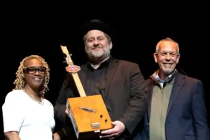 Weary Ramblers with Kathryn Severing-Fox (left middle) and Chad Elliott (right middle) being presented their award. Photo courtesy of The Blues Foundation