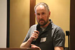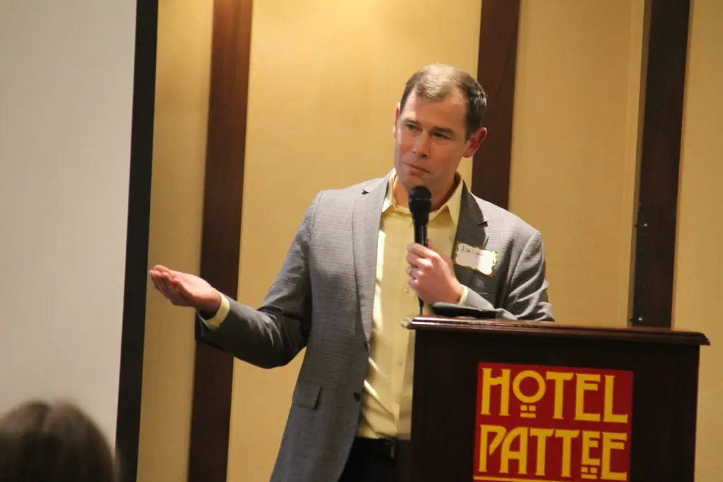 Jason Levan speaks during Perry Economic Development’s Annual Meeting on Feb. 26, 2026, at the Hotel Pattee. Allison Ullmann/Raccoon Valley Radio