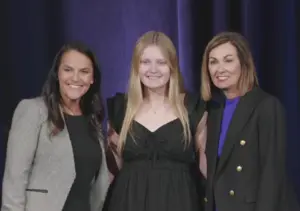 Becca Anderson (middle) with Lt. Gov. Chris Cournoyer (left) and Gov. Kim Reynolds (right). Photo courtesy of IHSAA and Farm Bureau