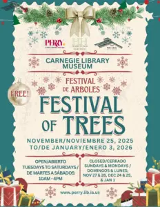 PERRY – Join in on the festive holiday tradition from November 25th to January 3rd as the Carnegie Library Museum opens the Festival of Trees. The free display is open Tuesday through Saturdays from 10am-4pm and closed Sundays and Mondays. They will be closed on January 1st.