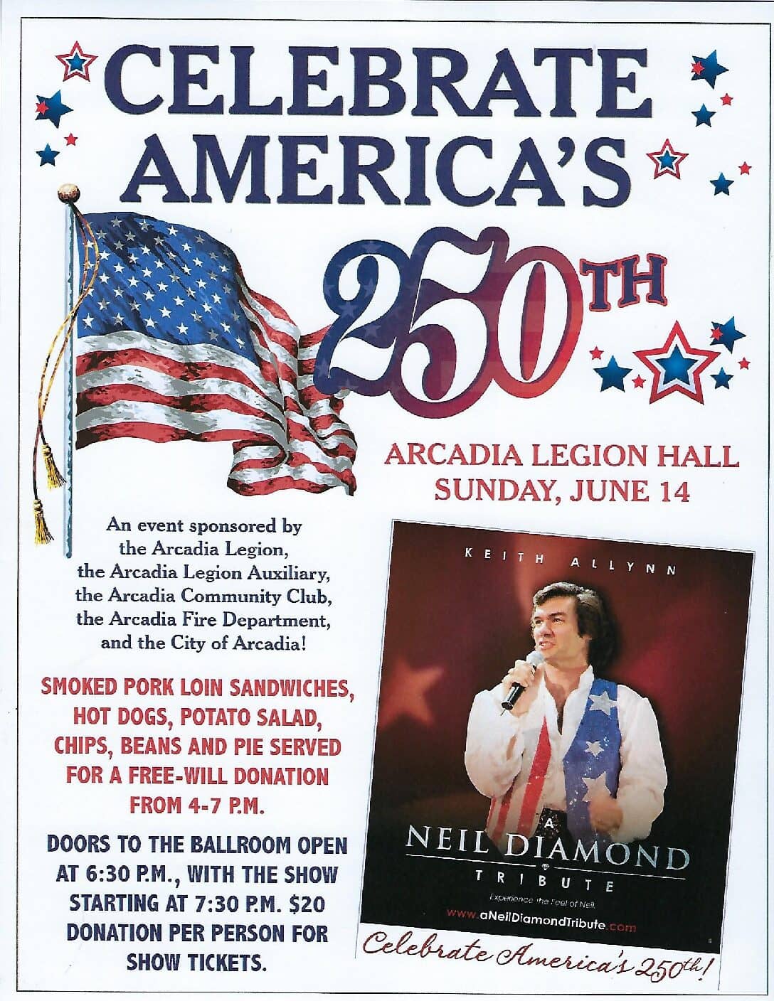 The Arcadia Legion will be hosting “A Neil Diamond Tribute” on June 14th at 7:30pm in the Arcadia Legion Hall. Preformed by Diamond look alike Keith Allynn. There will be a smoked pork loin sandwiches, hot dogs, potato salad, chips, beans and pie dinner served from 4 to 7pm for a free will donation, in the lower level dining hall. Doors to the