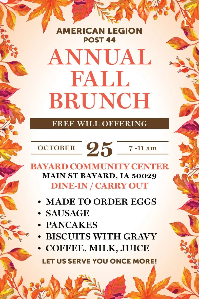 BAYARD – Come enjoy the American Legion Post #44 Annual Fall Brunch at the Bayard Community Center on October 25th from 7-11am. This is a free will offering event, serving made to order eggs, sausage, pancakes, and biscuits with gravy. Carry out is also available.