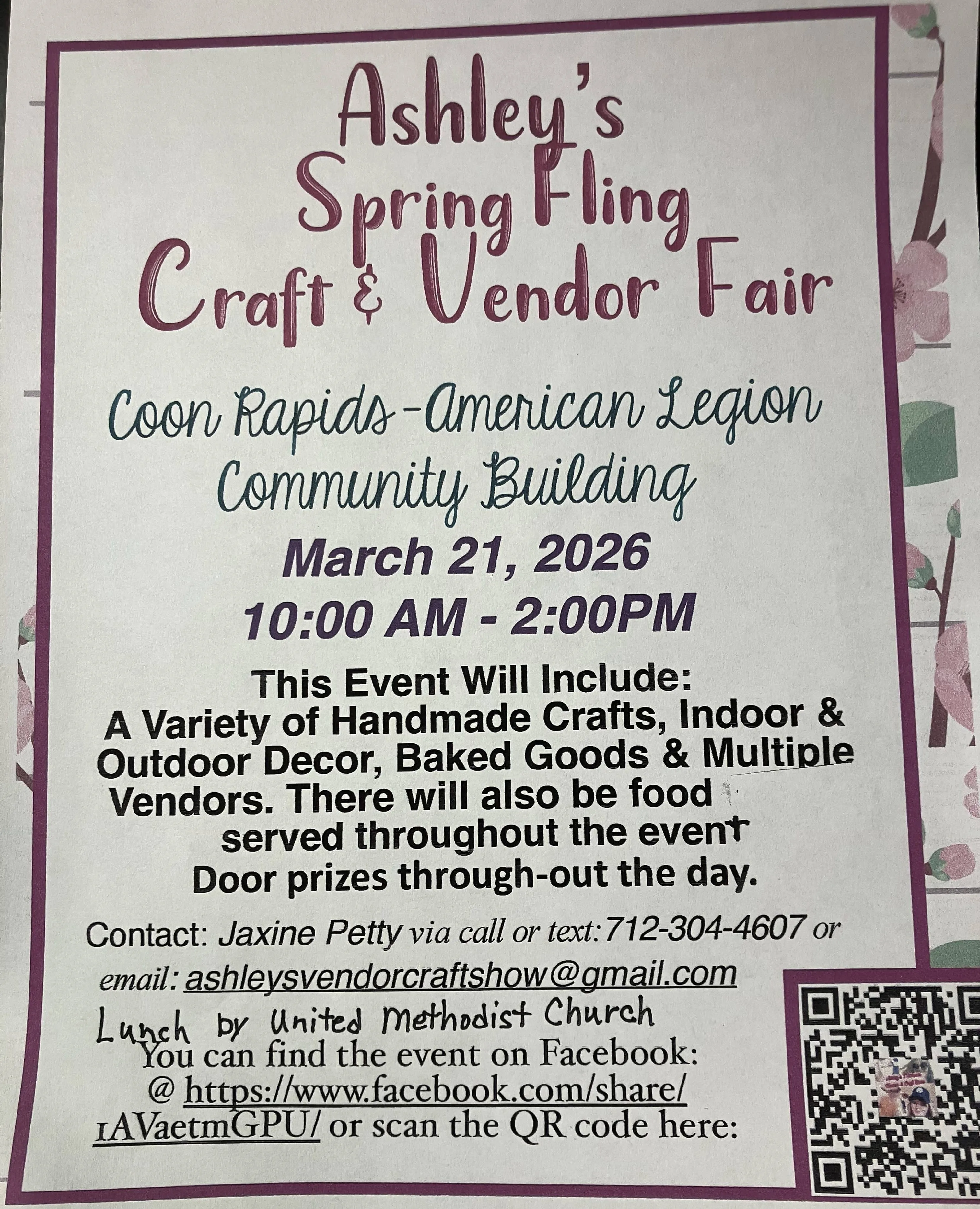 COON RAPIDS – Head on over to the Coon Rapids-American Legion Community Building on March 21st, for Ashley’s Spring Fling Craft & Vendor Fair from 10am-2pm.