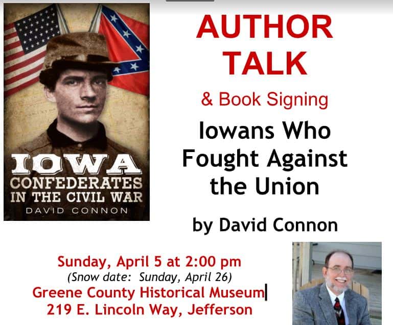 David Connon, the author of the book Iowans Who Fought Against the Union will be hosting a author talk and book signing on Sunday April 5th at 2:00 pm. It will be held at Greene County Historical museum in Jefferson with the program free and open to the public. Refreshments will be served.