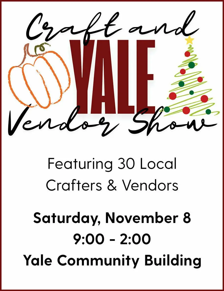 YALE – Visit the Yale Community Building on Saturday, November 8th for a Craft and Vendor Show. The show begins at 9am and concludes at 2pm, featuring 30 local crafters and vendors.