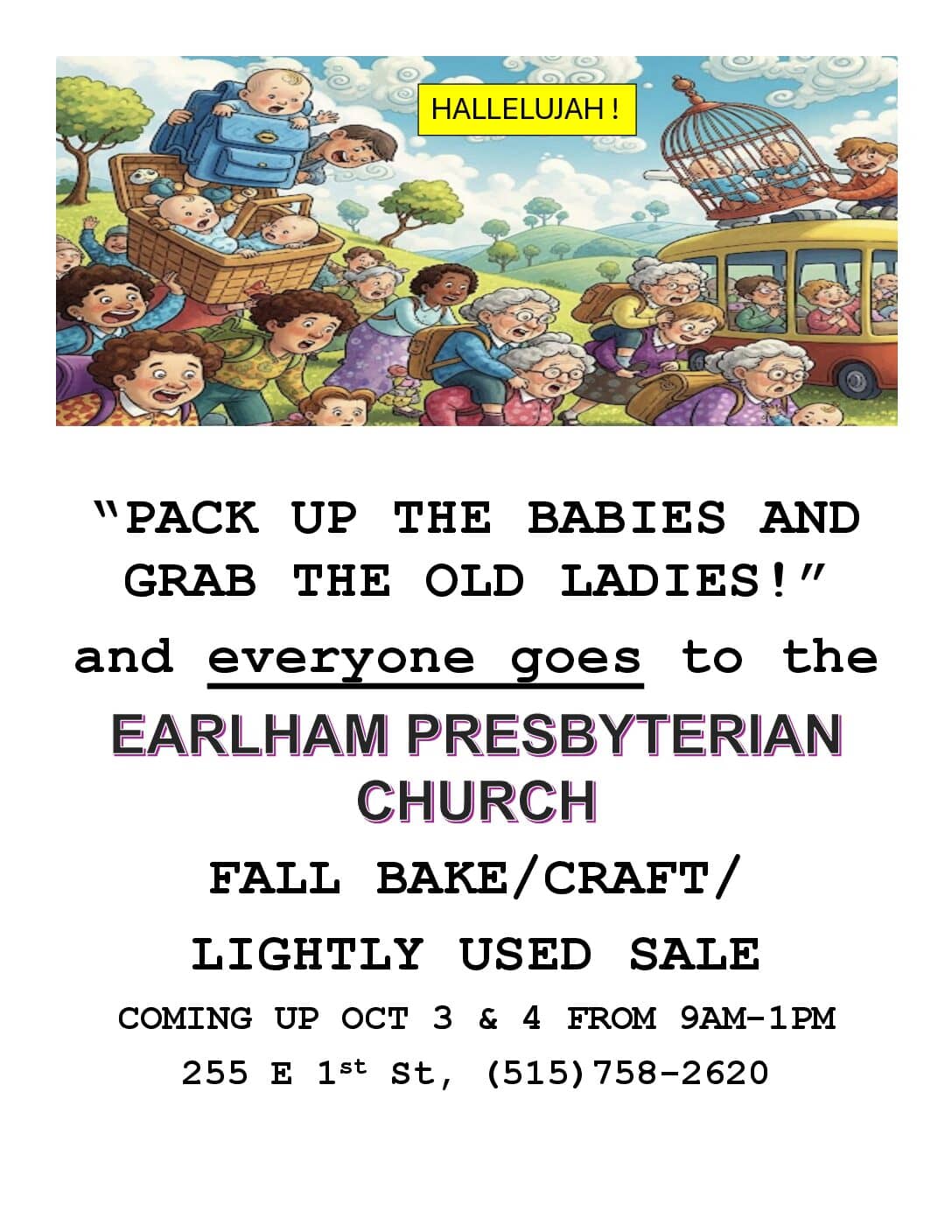 EARLHAM – Head to the Earlham Presbyterian Church on October 3rd and 4th for the Fall Bake/Craft/Lightly Used Sale from 9am-1pm.