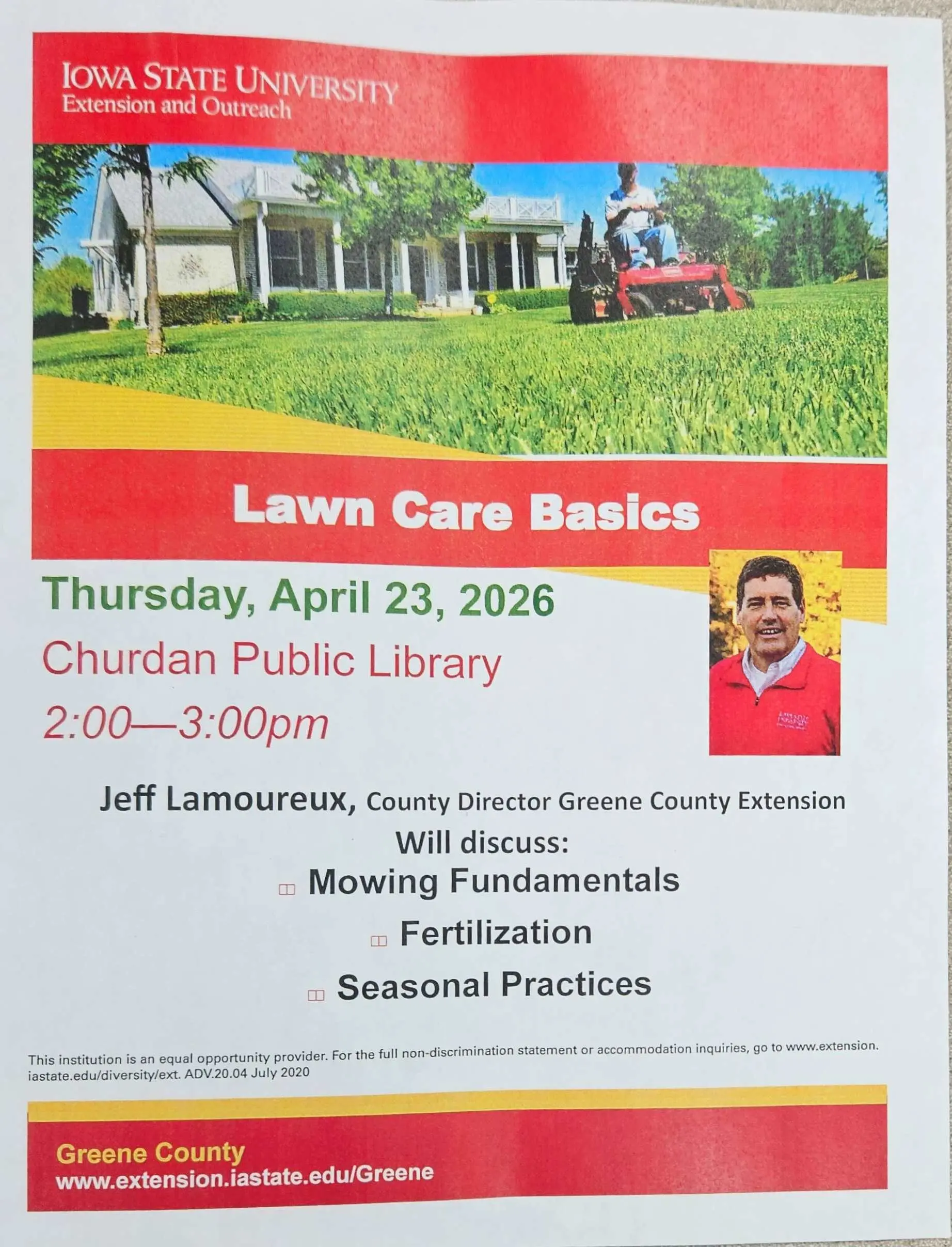 The Greene County Iowa State Extension and Outreach is hosting a course over lawn care basics April 23rd from 2-3pm at the Churdan Public Library .