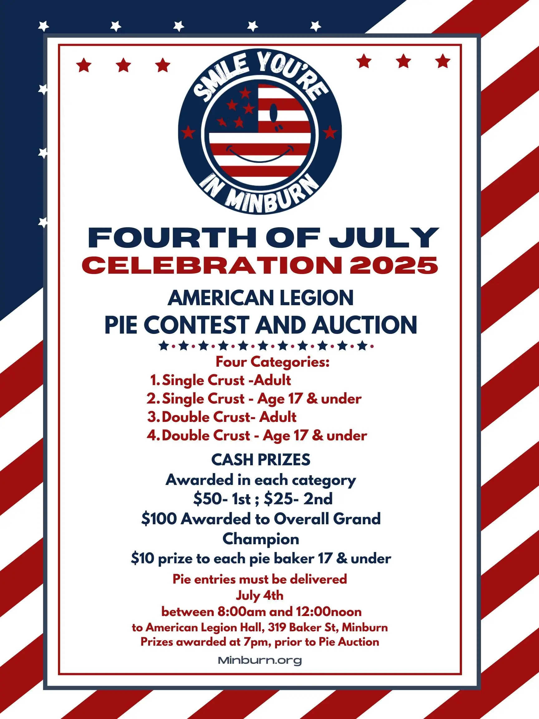 MINBURN – Join the Minburn American Legion on the fourth of July for a pie contest and auction. The four categories include: Single Crust -Adult, Single Crust – Age 17 & under, Double Crust – Adult and Double Crust – Age 17 & under.