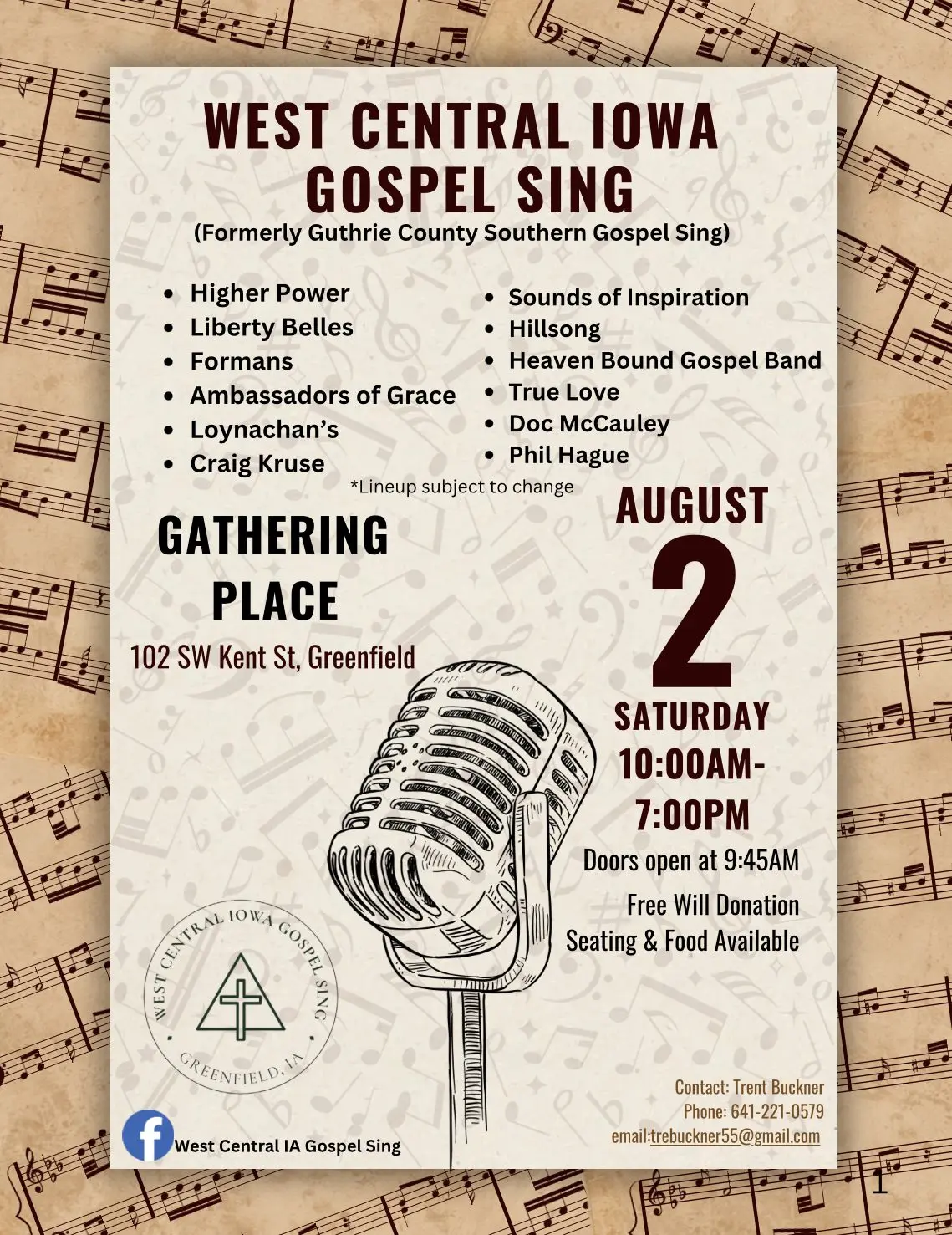GREENFIELD – Enjoy gospel music at the Gathering Place in Greenfield on Saturday, August 2nd from 10am-7pm with doors opening at 9:45am. The lineup is subject to change, but there are currently 12 groups scheduled to perform at the West Central Iowa Gospel Sing at the Gathering Place. Free will donation event with seating and food available.