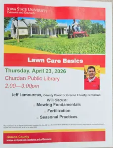 The Greene County Iowa State Extension and Outreach is hosting a course over lawn care basics April 23rd from 2-3pm at the Churdan Public Library .