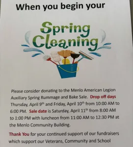 MENLO – It’s that time of year! The windows are open, the sun is shining, and you’re ready to clear out the clutter! If you’re tackling spring cleaning and have gently used items looking for a new home, don’t just toss them! The Menlo American Legion Auxiliary is holding their Spring Rummage and Bake Sale! We’re accepting CLEAN, slightly used items—think clothes, household goods, small decor—no electronics, please. Drop-offs are Thursday, April 9th, and Friday, April 10th, from 10 AM…
