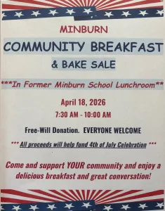 Minburn Community Breakfast and Bake Sale will be held in the former Minburn School Lunchroom on Saturday, April 18th from 7:30 am to 10 am.  Cost is a free will donation and everyone is welcome!  All proceeds will help fund the 4th of July Celebration.