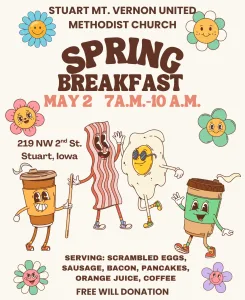 STUART – Join the Stuart Mt. Vernon United Methodist Church on Saturday, May 2nd for a delicious free will donation breakfast from 7-10am at Stuart Mt. Vernon United Methodist Church. Scrambled eggs, sausage, bacon, pancakes with orange juice or coffee will be served.